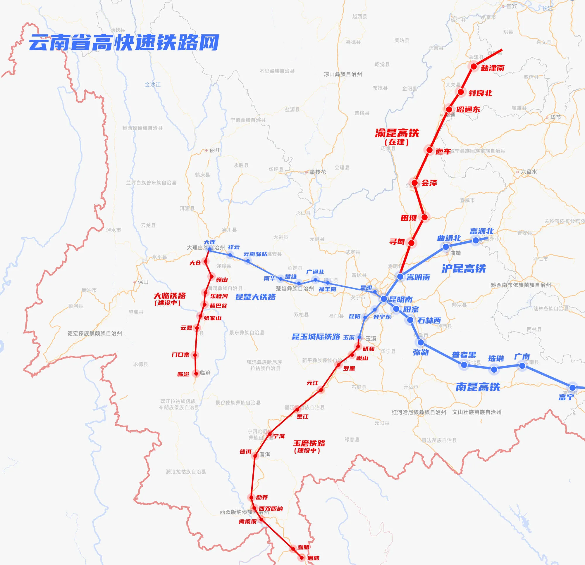 云南省高速铁路线网包括已开通运营的沪昆高铁、南昆高铁以及在建中的渝昆高铁等3条线路。
