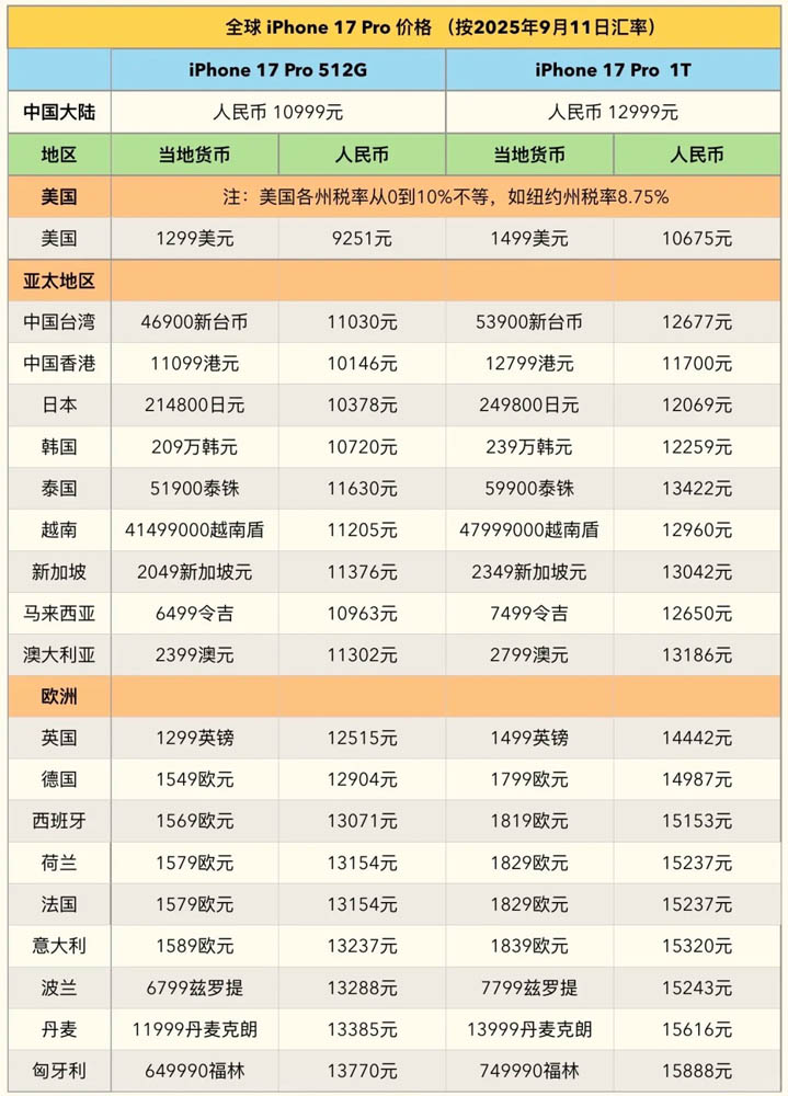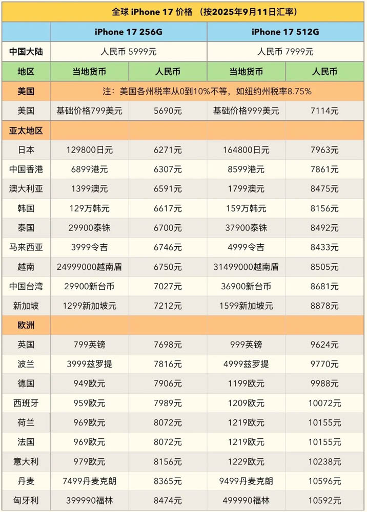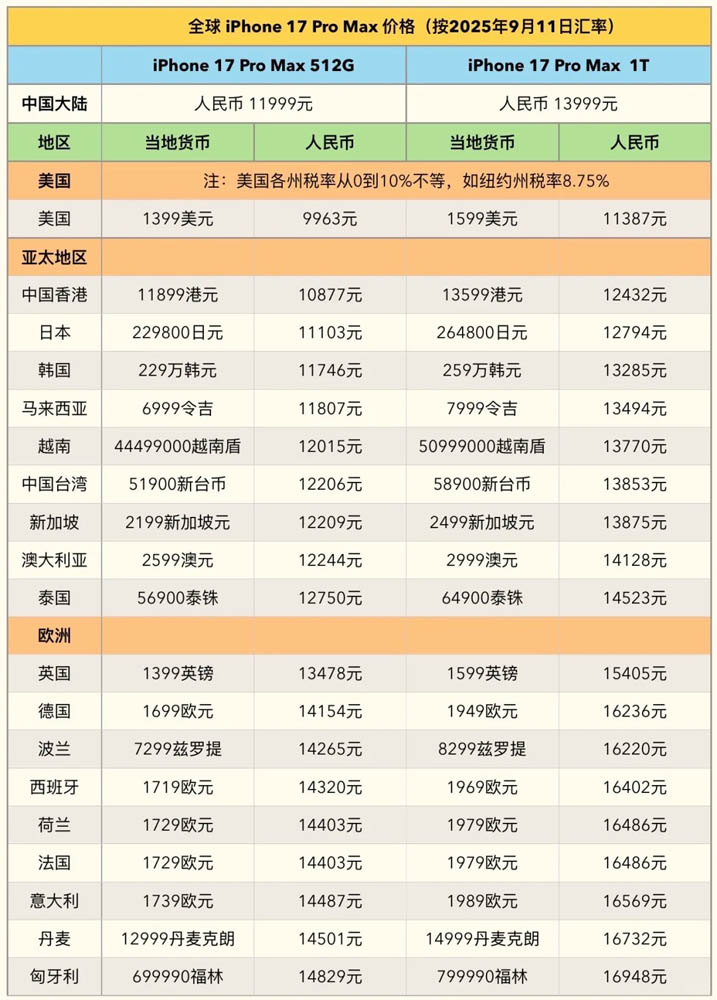 – 欧洲的价格非常恐怖,以iPhone 17 Pro Max 512G为例:欧洲最低是英国,13478元,比国行11999元高1500元;匈牙利更是高达14829元,比中国贵出将近3000元。其他欧洲国家价格基本都要比中国高2000-2500元不等。