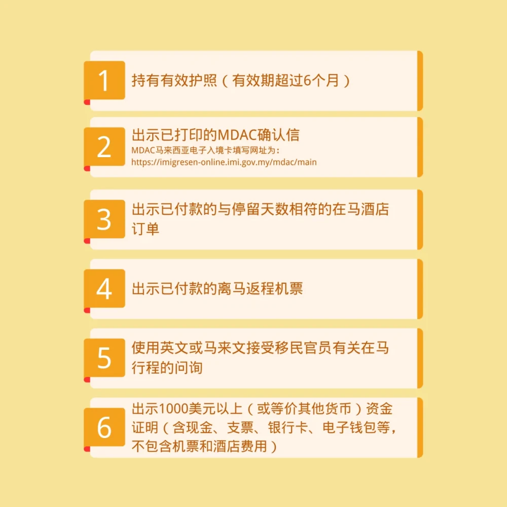 根据马来西亚政府主管部门要求,外国公民入境马来西亚前3天内需要在网上填报MDAC(马来西亚电子入境卡),并打印纸质版MDAC确认信,在入境时向移民官员出示。