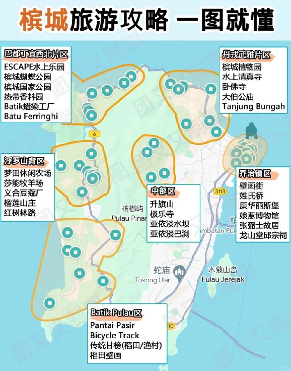另外,巴都丁宜西北片区的巴都丁宜海滩和槟城国家公园,以及槟岛中部的升旗山和极乐寺,也是热门的旅游目的地。