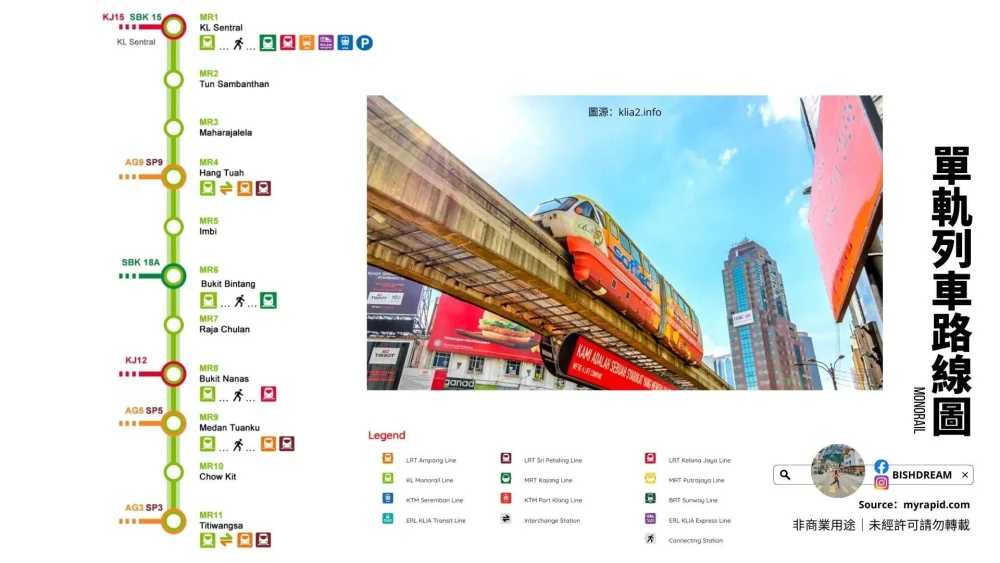 - 起点站:吉隆坡中央车站 (KL Sentral) ,吉隆坡交通枢纽,不管去哪里都可以先来这里换乘。