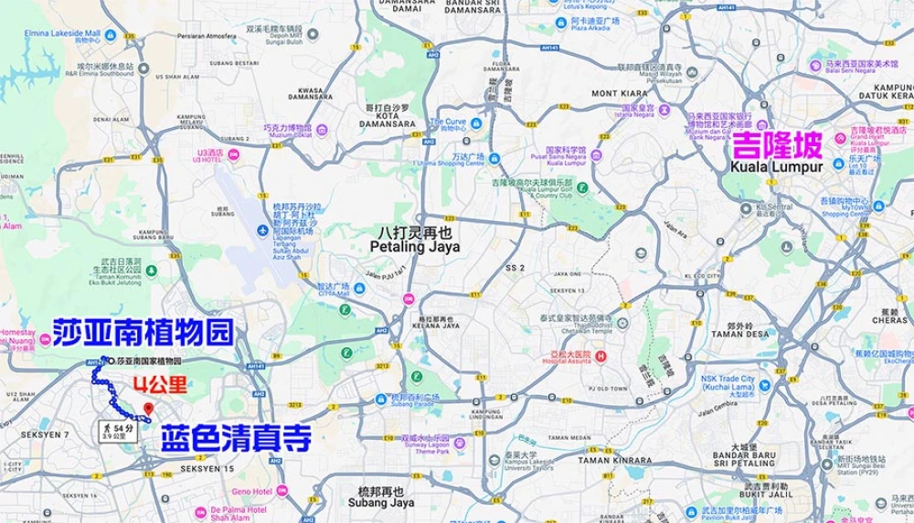 马来西亚吉隆坡蓝色清真寺旅游攻略 | 蓝色清真寺和莎亚南国家植物园旅游地图