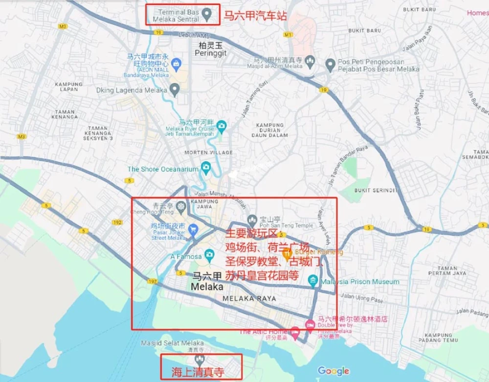马六甲的景点除了海上清真寺外基本都集中在一起,步行全程半小时。建议以鸡场街作为起点,马六甲汽车站打车到鸡场街大约15-20分钟。