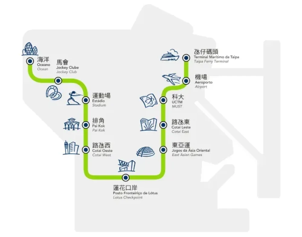 澳门目前只有一条轻轨线路(凼仔线),全长9.3公里共11个车站,往返海洋站至凼仔码头站,途经主要旅游区,包括码头、机场、陆路口岸、酒店及凼仔景点。比较适合乘坐渡轮抵达凼仔和入住凼仔区内酒店的游客。