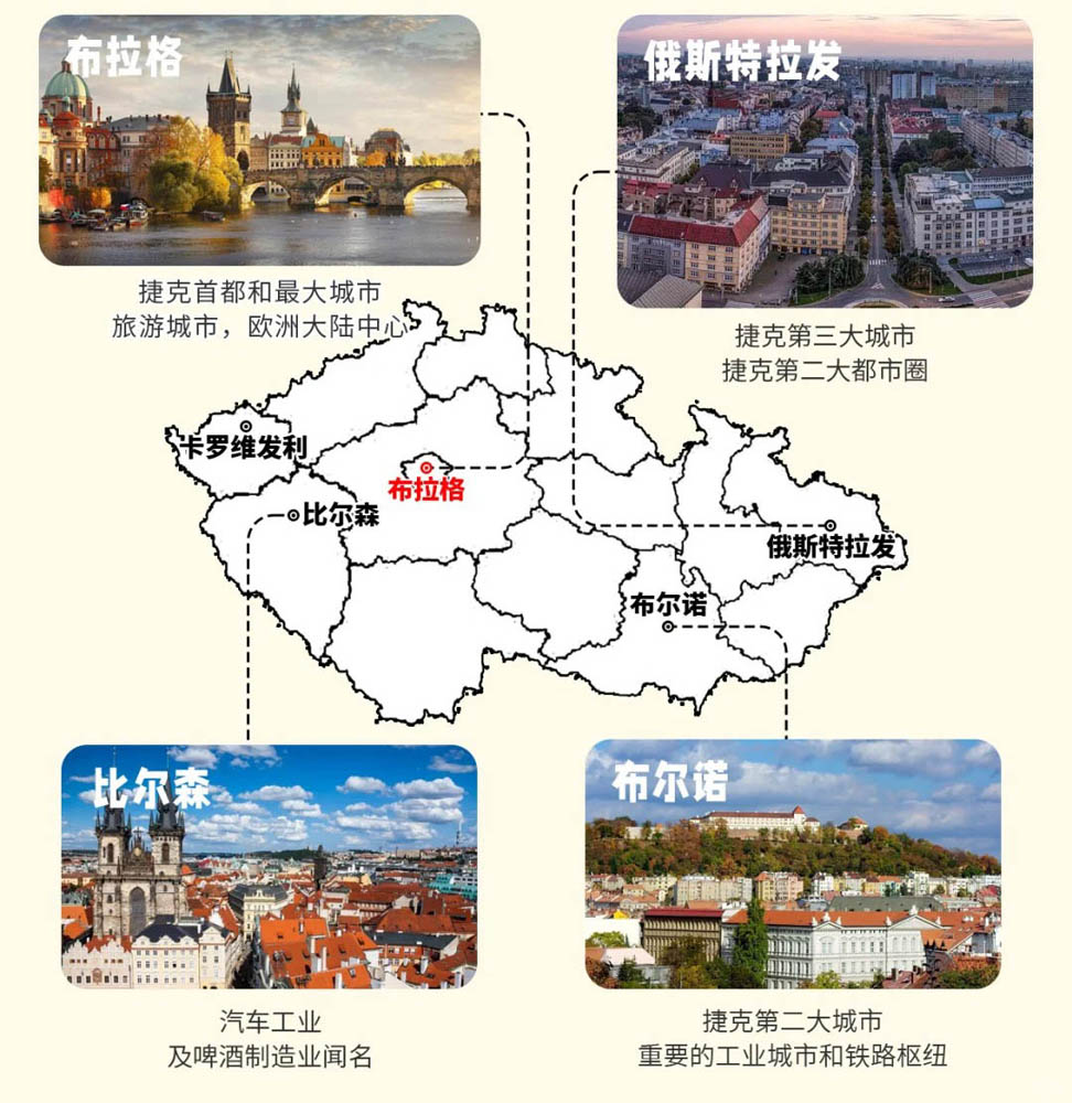 1993 年,基于民族差异,捷克斯洛伐克和平分裂为捷克共和国与斯洛伐克共和国,捷克成为独立主权国家,后加入欧盟与北约,经济稳定发展,成为中东欧地区的发达国家之一。