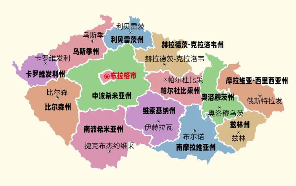 捷克为单一制国家,全国共划分为14个州级单位,包括13个州 (Kraj) 和布拉格首都直辖市 (Hlavní město)。