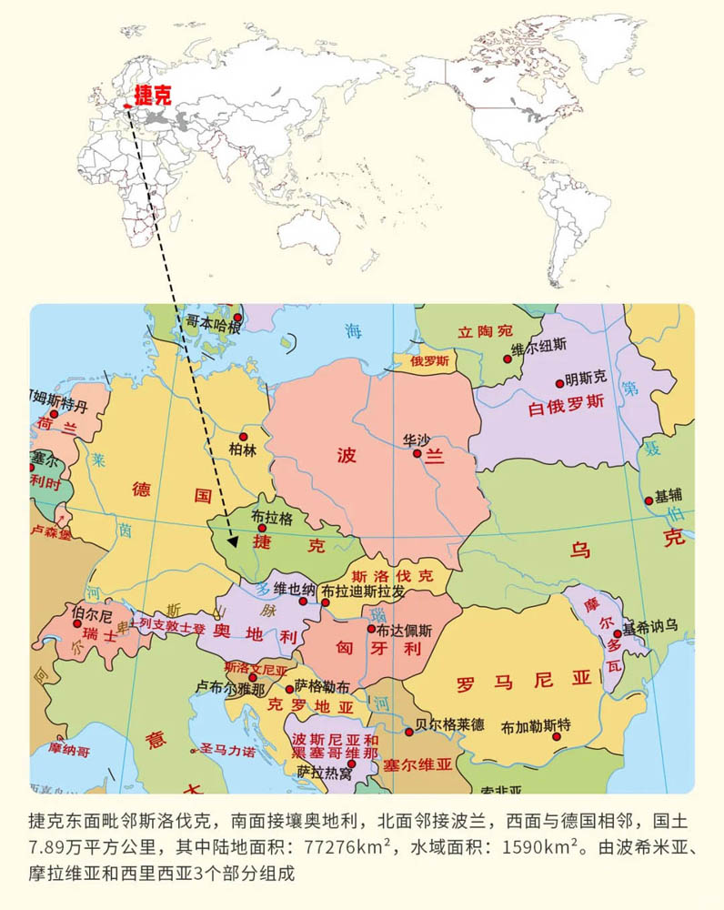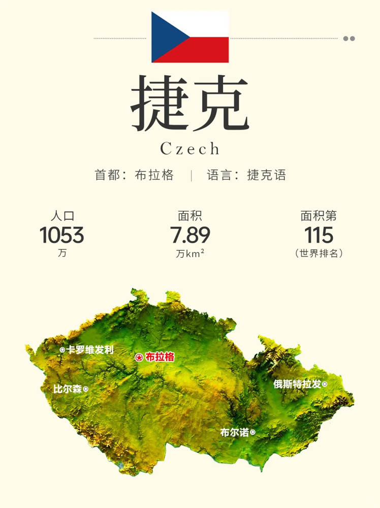 捷克全称捷克共和国,地处中欧。东靠斯洛伐克,南邻奥地利,西接德国,北毗波兰。