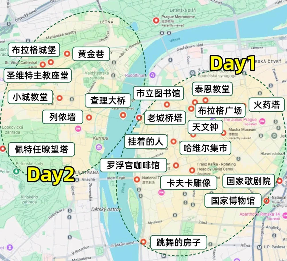 如果时间仓促只能走马观花,可以跟着这条布拉格步行路线图快速游览主要打卡点。如果在布拉格时间够长,也同样建议抽出一天的时间走一遍这条路线做city walk。