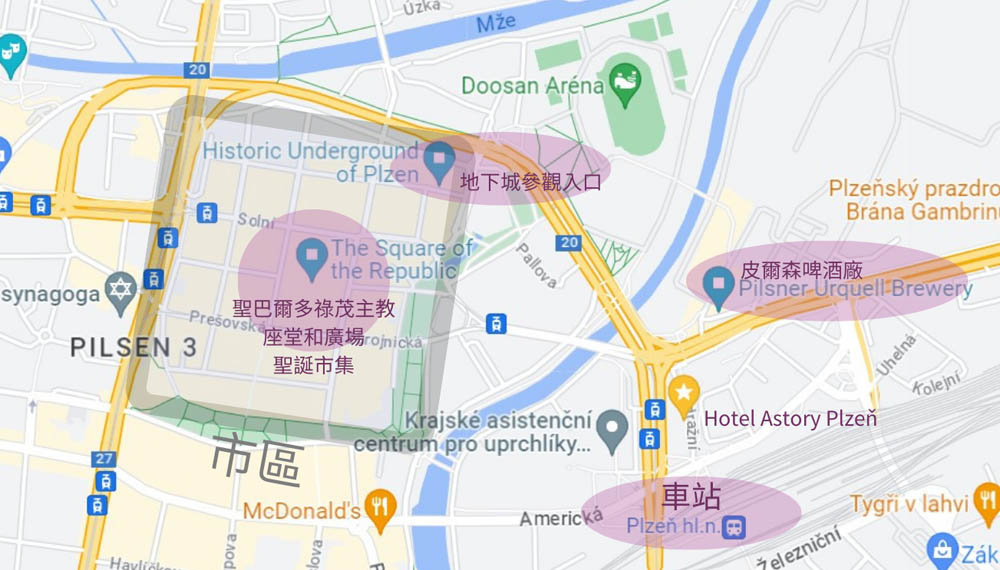 皮尔森老城区以共和国广场Náměstí Republiky为中心,四周环绕着树木成排的花园,正中央矗立着圣巴特罗明大教堂、北面隔街是建于公元1558年的老市政厅。