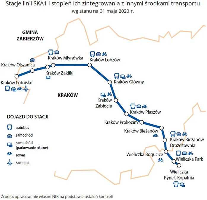 SKA1线连接克拉科夫机场 (Kraków Lotnisko) 和维利奇卡盐矿 (Wieliczka Rynek – Kopalnia),途经克拉科夫火车总站 (Kraków Główny),全线共16站。