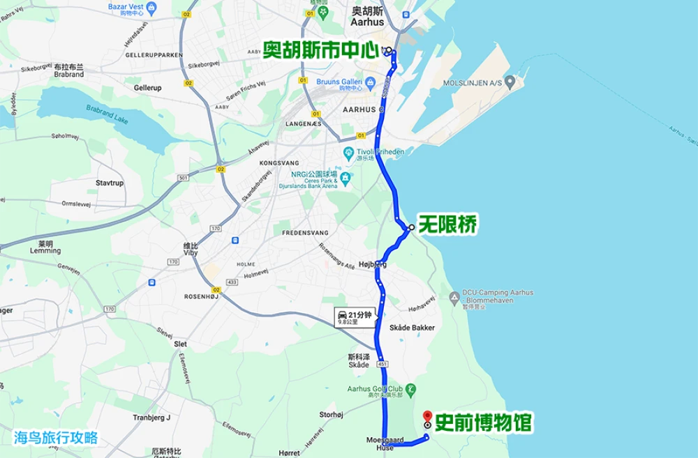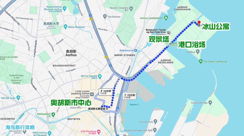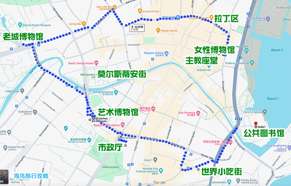 我们以奥胡斯老城市中心的奥胡斯主教座堂为出发点,步行走访奥胡斯市中心的主要景点,按照图示走完一圈总路程5公里左右。