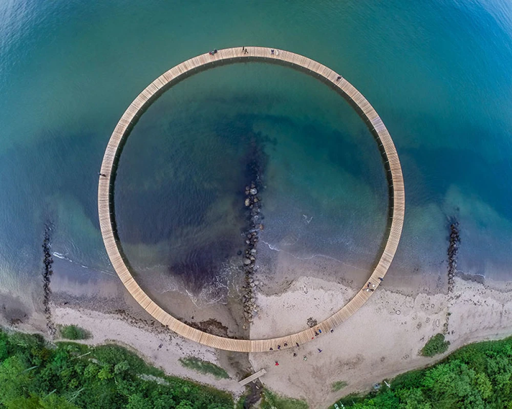 这是一座位于海边,可以让人领略到无限海景与风光的环状桥梁。原本是一件临时的艺术作品,后来保留下来成为永久性建筑。圆圈直径60米,一半位于沙滩之上,另一半延伸到大海之中,环形的设计真的有一种无限循环的感觉。