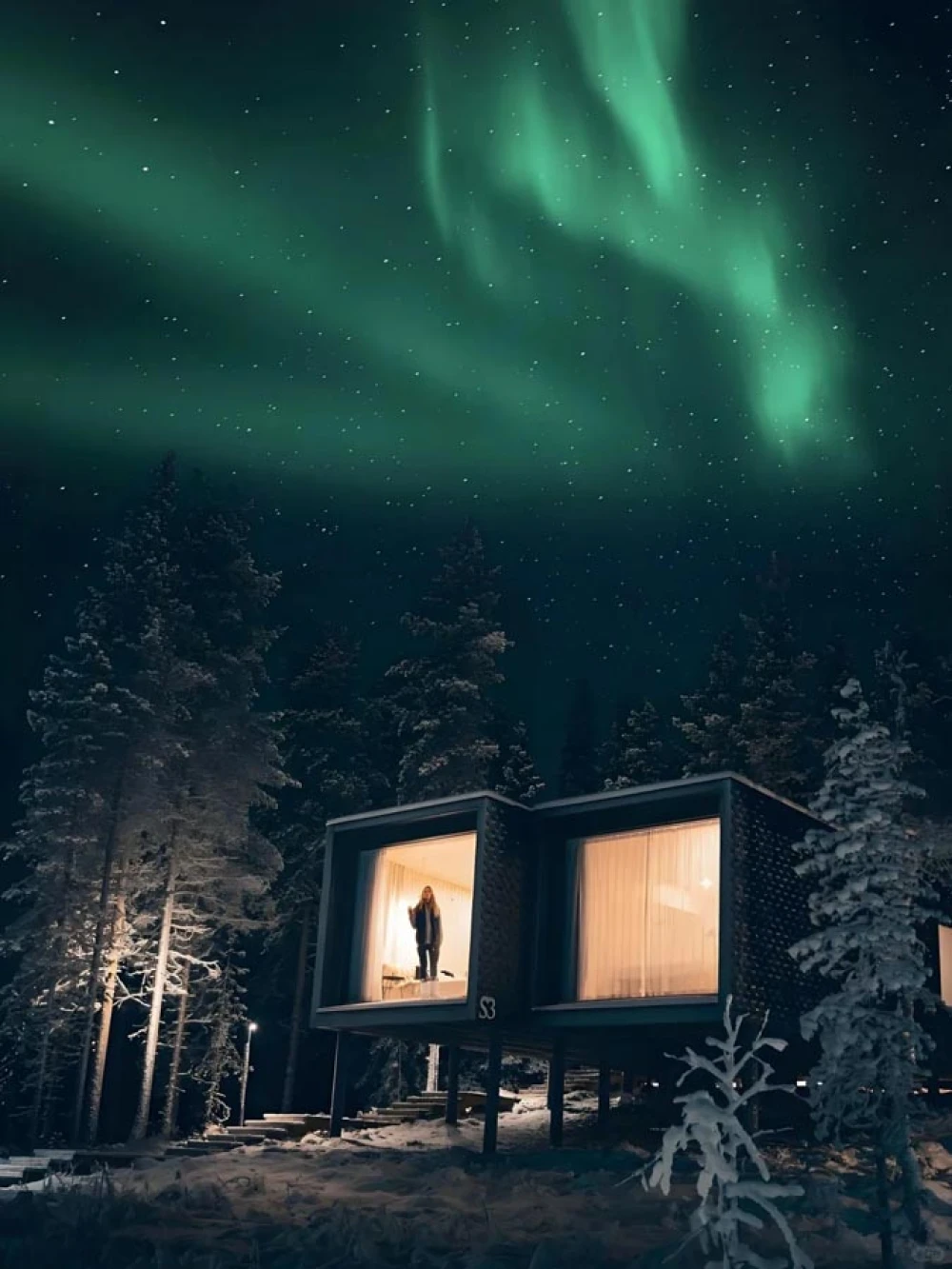 每年 9 月到次年 3 月,无数旅行者奔赴芬兰,只为在寒冷夜晚追寻美丽的欧若拉。从前看极光,人们得忍受酷寒,在冰天雪地中等待欧若拉 “跳舞”,但如今有了极光玻璃屋,只需躺在温暖玻璃屋内舒适的床上,就能惬意观赏极光。