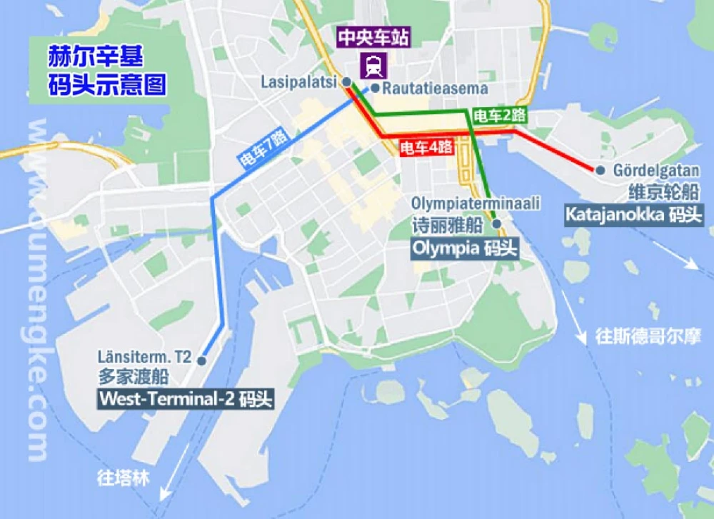 维京公司的赫尔辛基-斯德哥尔摩航线使用的是赫尔辛基南港卡塔亚诺卡码头(Eteläsatama Katajanokka Terminal)。