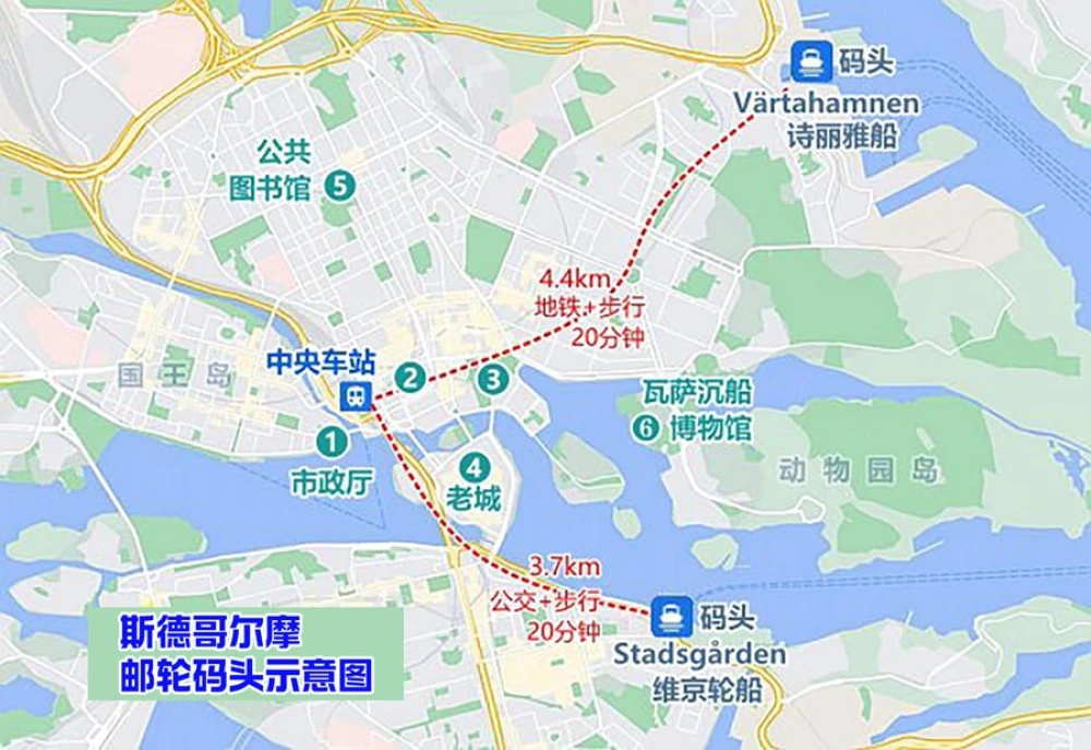 交通:中央车站出发,乘地铁红线,坐3站6分钟,到Gärdet站;步行1km,约12分钟到码头。