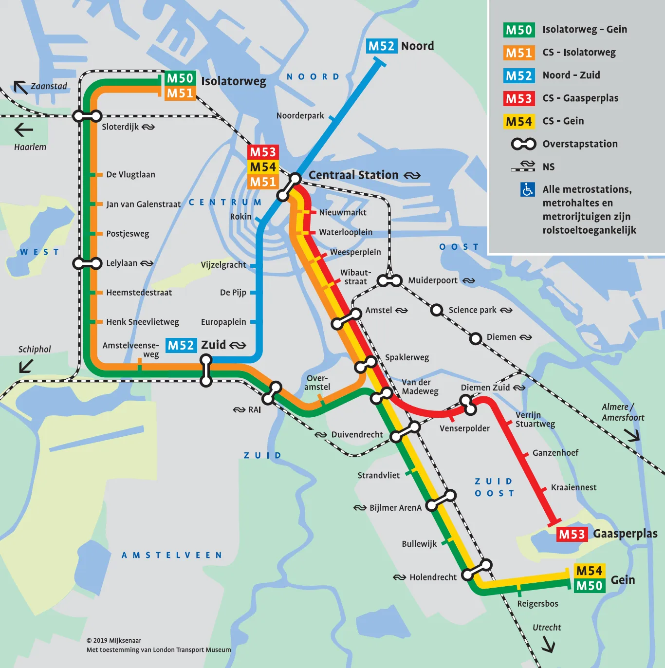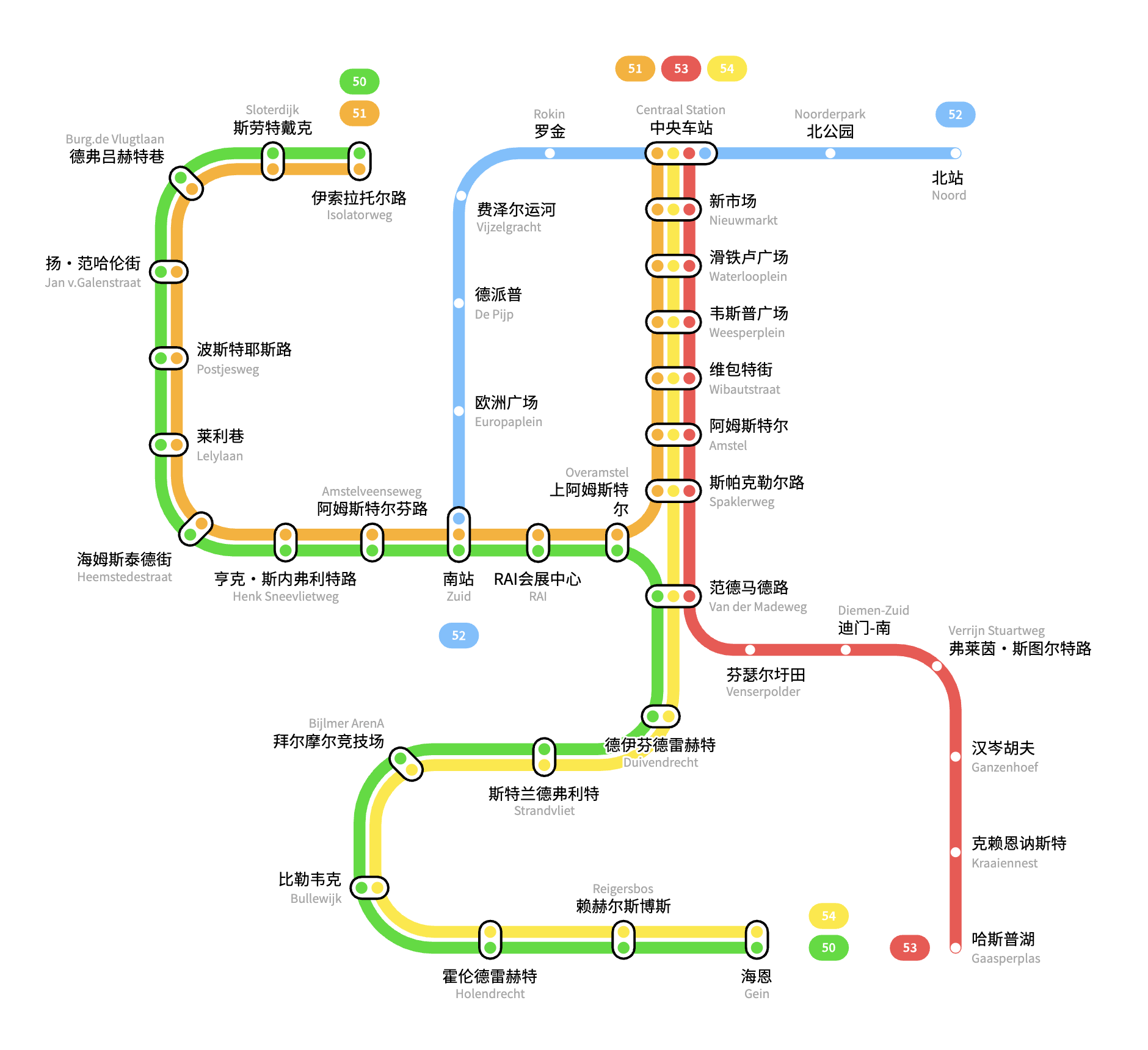 阿姆斯特丹地铁主要连接阿姆斯特丹和周边区域,其中51号线、53号线和54号线均以中央车站为起点。