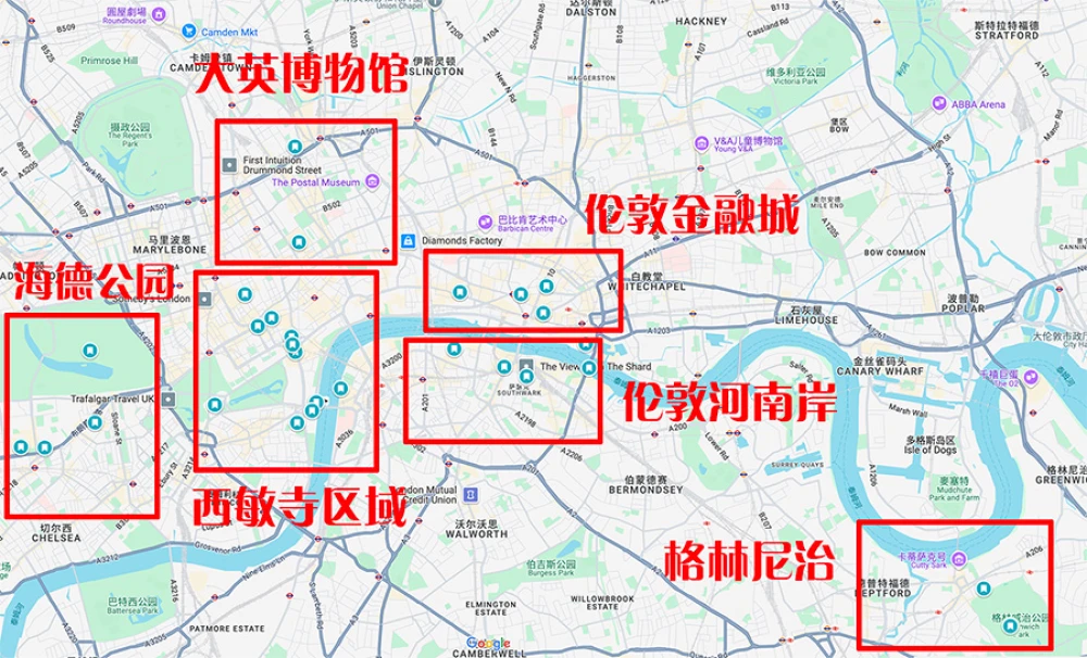 我把伦敦市内景点划分为6个区域。