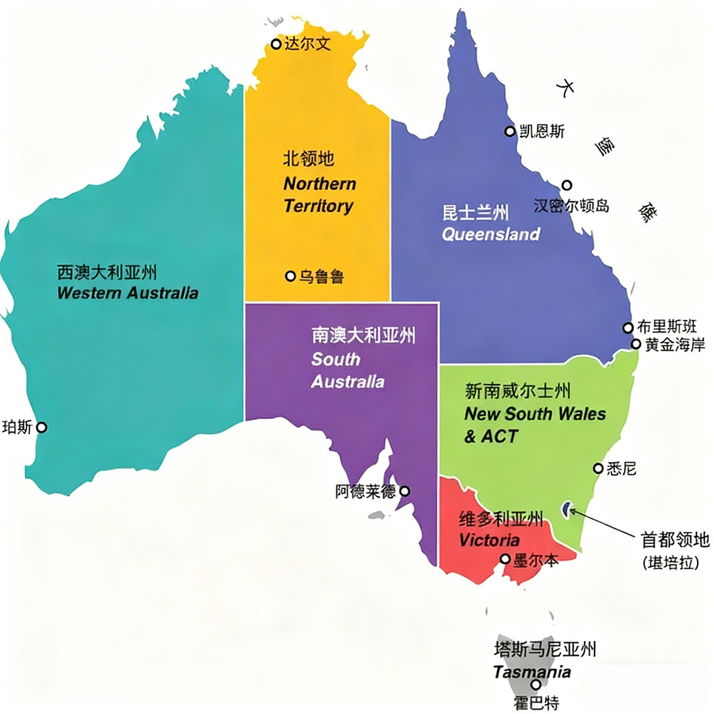 澳大利亚全国共划分为8个一级行政单位,分别是六个州和两个领地。
