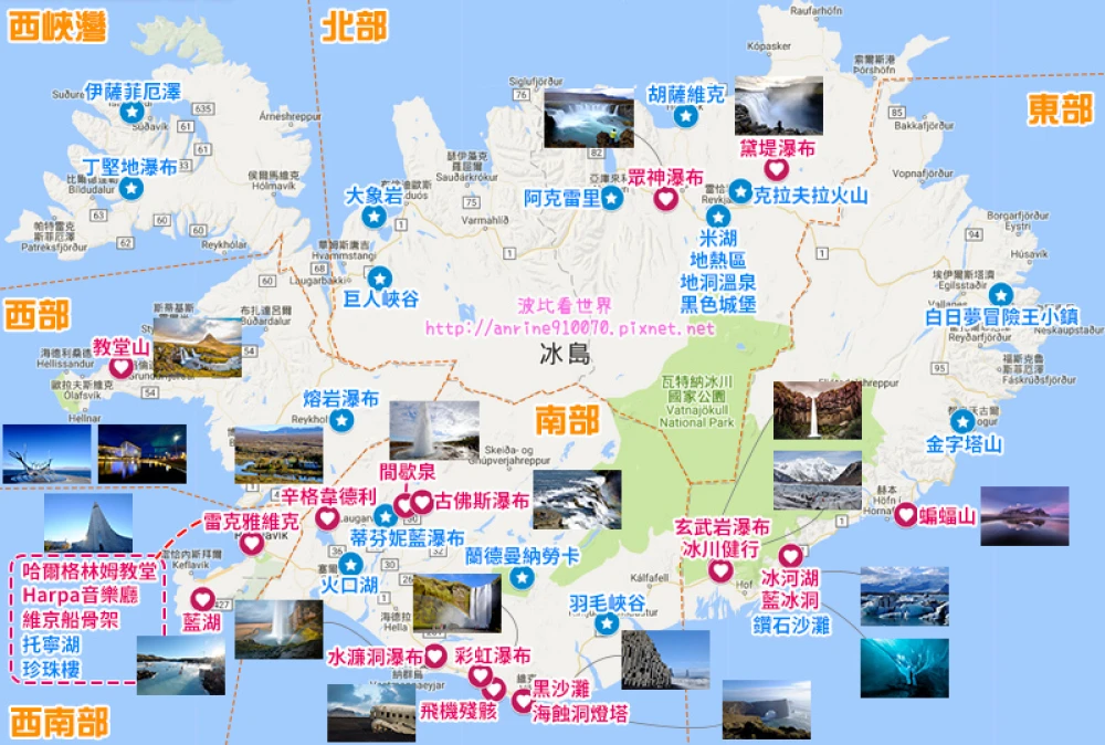 冰岛大致可以区分为西南部、南部、东部、北部、西部、西峡湾六大块。