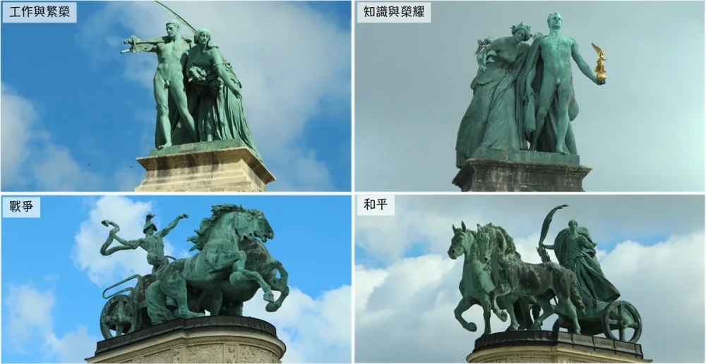 纪念碑顶部是大天使加布里埃尔的雕像,手中拿着匈牙利圣冠与双杠十字架,周围环绕着匈牙利历史上重要国王和领袖的雕像。